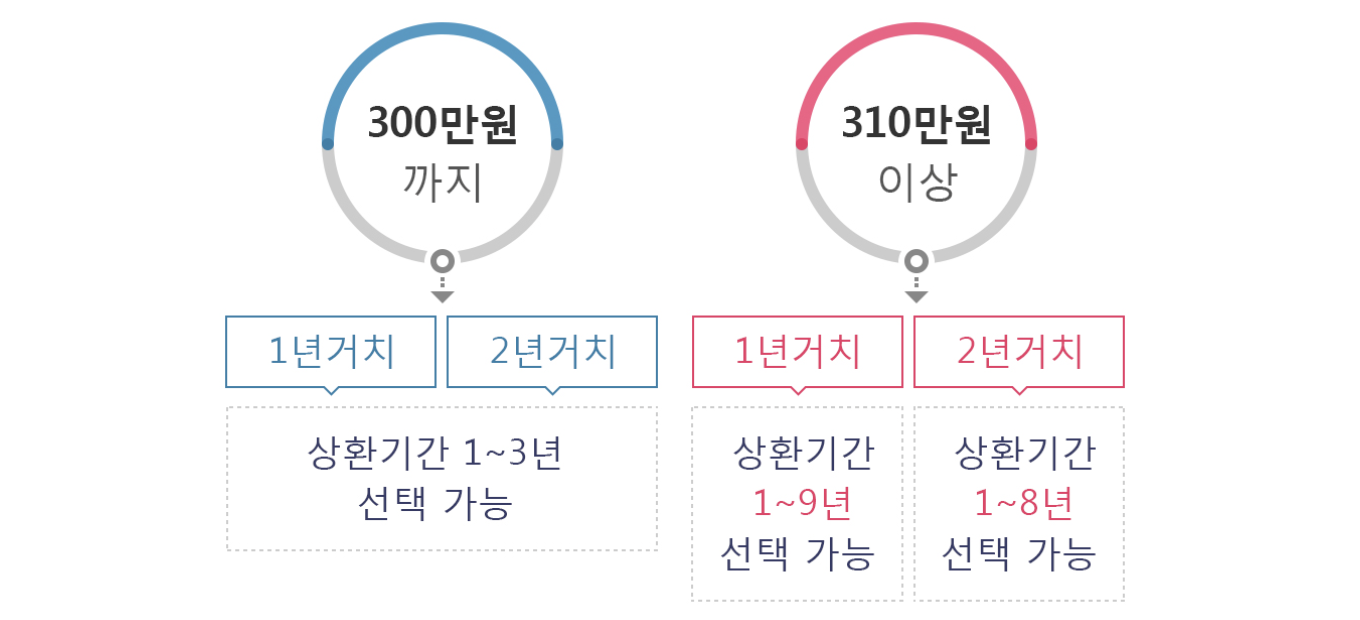 - 거치(이자 납부) 후 원리금(원금+이자) 균등분할상환 최장 9년